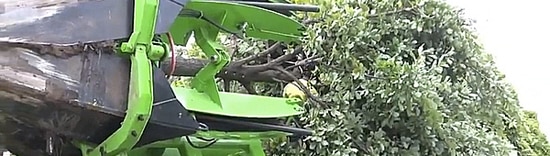 Une fois les racines de l’arbre isolées par les lames qui se referment et contiennent ainsi la motte de terre nécessaire à la replantation, l’engin est lentement remonté.
